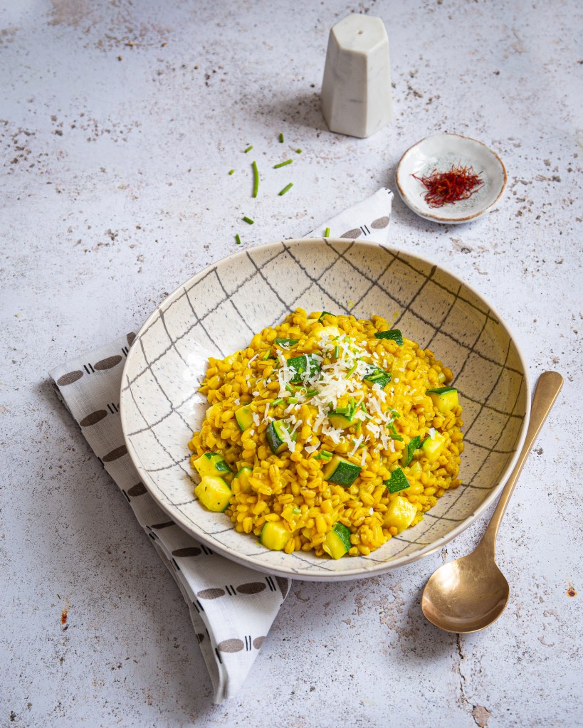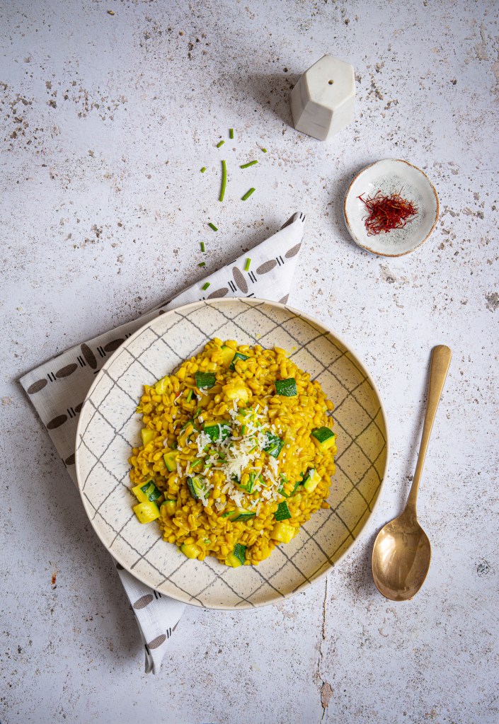 We created this alternative risotto using barley, also known by its Italian name: orzo. Barley is an incredible whole grain which is often added to soups and summer salads in Italy. It is full of fibre (10.5g per 100g), minerals such as molybdenum, manganese, selenium and has a lovely nuttier taste compared to rice. If you are allergic or intolerant to gluten, please note that orzo/barley contains it.