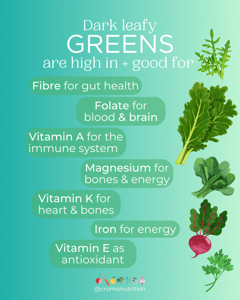 - Fibre is absolutely crucial to our health – it helps the food travelling through our digestive system, modulates blood-sugar level and supports our cardiovascular health. Some greens that are especially high in fibre are Turnip greens and Beetroot greens.